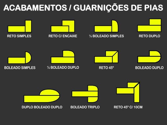 Acabamento Lateral - São os diversos modelos de acabamentos que são utilizados para trabalhar a borda das pedras, mais utilizados em pias, lavatórios, lavabo, mesas, aparadores, bancadas e etc.